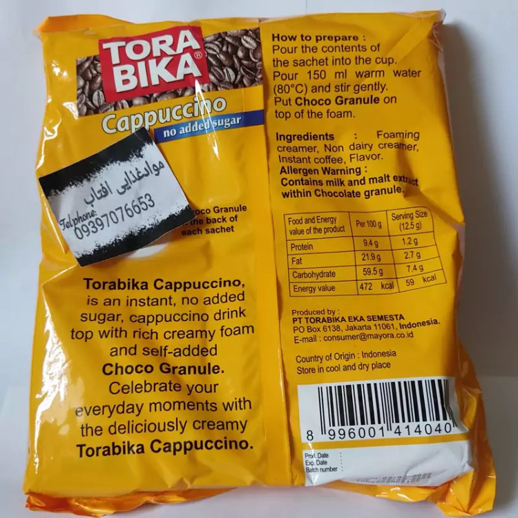 کاپوچینو فوری و بدون شکر رژیمی تورابیکا 20 عددی ( 20 ساشه ای ) بهمراه پودر شکلات جداگانه که با کف مناسب و طعم و عطر بسیار عالی از نوشیدنی های بسیار پرطرفدار محسوب میشود که برای افراد رژیمی و ورزشکاران نیز مناسب میباشد .نحوهی مصرف:محتوی یک ساشه را در فنجان ریخته، سپس 150 میلیلیتر آب 80 درجه سانتی گراد اضافه کرده و به آرامی هم بزنید. پودر شکلات را بر روی کف بریزید و نوش جان کنید .