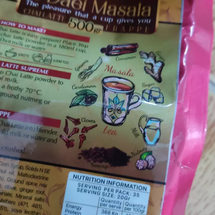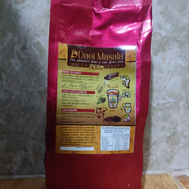 مواد تشکیل دهنده: قهوه. کاکائو. هل. دارچین.شکر زنجبیل. میخک. جوز. شیرخشک مخصولی از شرکت دائی ماسالا وزن خالص 500 گرم تاریخ دار